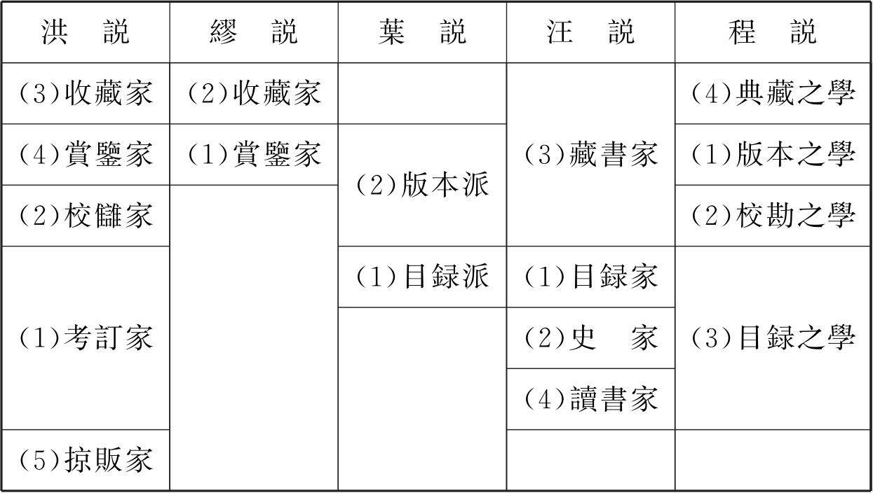 至名稱而外,範疇若何,自來學人,亦有數説。“藏書家有數等。得一書必推求本源,是正缺失,是謂考訂家,如錢少詹大昕、戴吉士震諸人是也。次則辨其板片,注其錯訛,是爲校讎家,如盧學士文弨、翁閣學方綱諸人是也。次則收采異本,上則補金匱石室之遺亡,下可備通人博士之瀏覽,是謂收藏家,如鄞縣范氏之天一閣、錢塘吴氏之瓶花齋、崑山徐氏之傳是樓諸家是也。次則第求精本,獨嗜宋刻,作者之旨意縱未盡窺,而刻書之年月最所深悉,是謂賞鑒家,如吴門黄主事丕烈、鄔鎮鮑處士廷博諸人是也。又次則於舊家之中落者,賤售其所藏;富室之嗜書者,要求其善價。眼别真贋,心知古今。閩本蜀本,一不得欺;宋槧元槧,見而即識,是謂掠販家,如吴門之錢景開、陶五柳,湖州之施漢英諸書估是也。”此洪亮吉《北江詩話》之説一也。“自劉、班志藝文,而後人得考天府之儲存;自晁、陳傳書目,而學者藉見私家之著述。海内流傳,或鈔或刻,不下百數十種,然亦分爲兩派:一則宋刊明鈔,分别行款,記刻書之年月,考前賢之圖記,此賞鑒家也。一則包括四部,交通九流,蓄重本以備校讎,鈔新帙以備瀏覽,此收藏家也。”此繆荃孫《〈古學匯刊〉序目》之説二也。“近世言藏書者,分目録版本爲兩種學派。然二者皆兼校讎,是又爲校勘之學。”此葉德輝《書林清話》之説三也。“綱紀群籍、簿屬甲乙者,則目録家之目録是也。辨章學術、剖析源流者,則史家之目録是也。鑒别舊槧、校讎異同者,則藏書家之目録是也。提要鉤元、治學涉徑者,則讀書家之目録是也。”此汪辟疆師《目録學研究》之説四也。嘗試考之,洪氏所言,乃就藏書者流立論,非一指治書之學。所謂掠販之輩,直書估之精於鑒别者爾,奚足名家?若考訂一項,則治書雖不廢考訂,然考訂之學,又非治書之學所能包,是二者但交相爲用而已。故所標舉,獨校讎、收藏、賞鑒三家可稱治書之學,而不及書籍部次。繆氏所陳,又隘於洪,蓋與黄丕烈同以鑒藏爲主。葉氏舉目録版本爲藏書家之兩派,謂皆兼校勘。然藏書亦自有其道,非目録版本而兼校勘即可盡者。至汪先生持論,殆以目録爲宗,其所云目録家、史家、讀書家者,皆目録學之流派爾,餘則併入之藏書家。見仁見智,廣狹之殊,抑又如此。