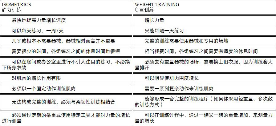 李小龙将负重训练与静力训练都纳入自己的整体训练计划中,但他并不认为这两种力量训练方法的原则、作用、效果是相同的。尽管两种训练方法都能够增强力量,但它们的目标和效果是有区别的。静力训练在迅速提高肌肉强度与力量的同时,对增长肌肉耐力方面的作用并不显著。因此静力训练并不是一个完整独立的练习内容,必须与有氧运动、柔韧性训练相结合。而负重训练可以增大肌肉块,对于初学者而言,这可能是其追求的目标,也可能不全是。因为训练动作会让肌肉一次又一次(不断重复)进行大幅度运动,这会使你在增加力量的同时,提高柔韧性、肌肉质量和耐力。
