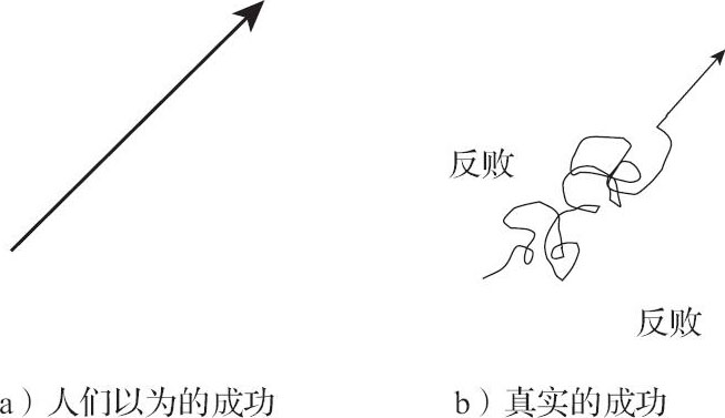 人们以为成功是一马平川的直线(见图1-3a),真实的成功却是一条九曲十八弯的折线(见图1-3b)。这九曲十八弯就是你绕不过去的反败历练。大大小小的反败构成了创业的无限可能,很像取到真经的唐僧师徒闯过的九九八十一难。