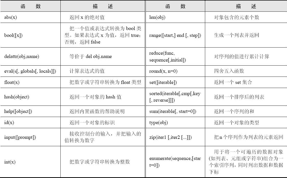 Python提供了一个内联模块buildins。内联模块定义了一些开发中经常使用的函数,通过dir(buildins)可以查看内联模块中所有的内置函数,利用这些函数可以实现数据类型的转换、数据的计算、序列的处理等功能。下面将介绍内联模块中常用的函数。