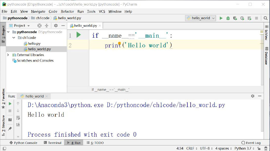单击“File”→“New”菜单,选择对应的文件类型后便可以新建文件,并在其中编写Python程序。现在开始创建hello_world.py文件,编写完代码后选择“Run”菜单中的Run命令或者按Alt+Shift+F10组合键即可运行代码,如图1-17所示。