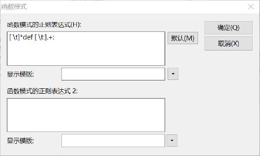 4)单击“函数列表”按钮,打开“函数模式”对话框,如图1-24所示。在“函数模式的正则表达式(H)”文本框中输入[\t]*def[\t].+:,单击“确定”按钮,保存设置。