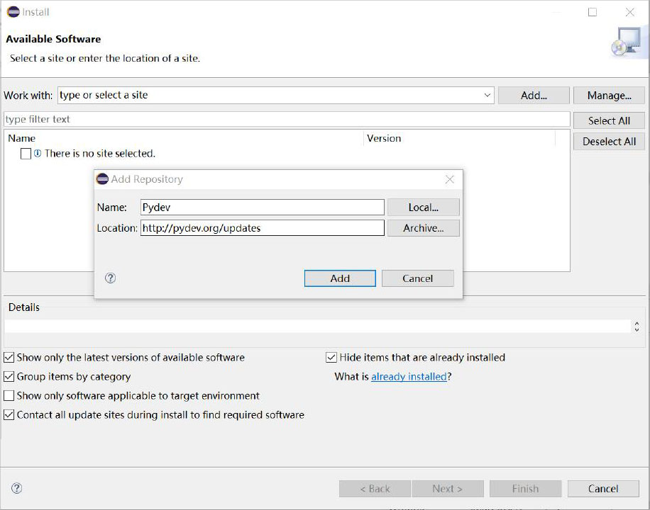 1)启动Eclipse,依次单击菜单“Help”→“Install New Software...”,在弹出的对话框中,单击“Add”按钮,再弹出Add Repository对话框,在Name文本框中填写Pydev,在Location文本框中填写 http://pydev.org/updates ,如图1-18所示。