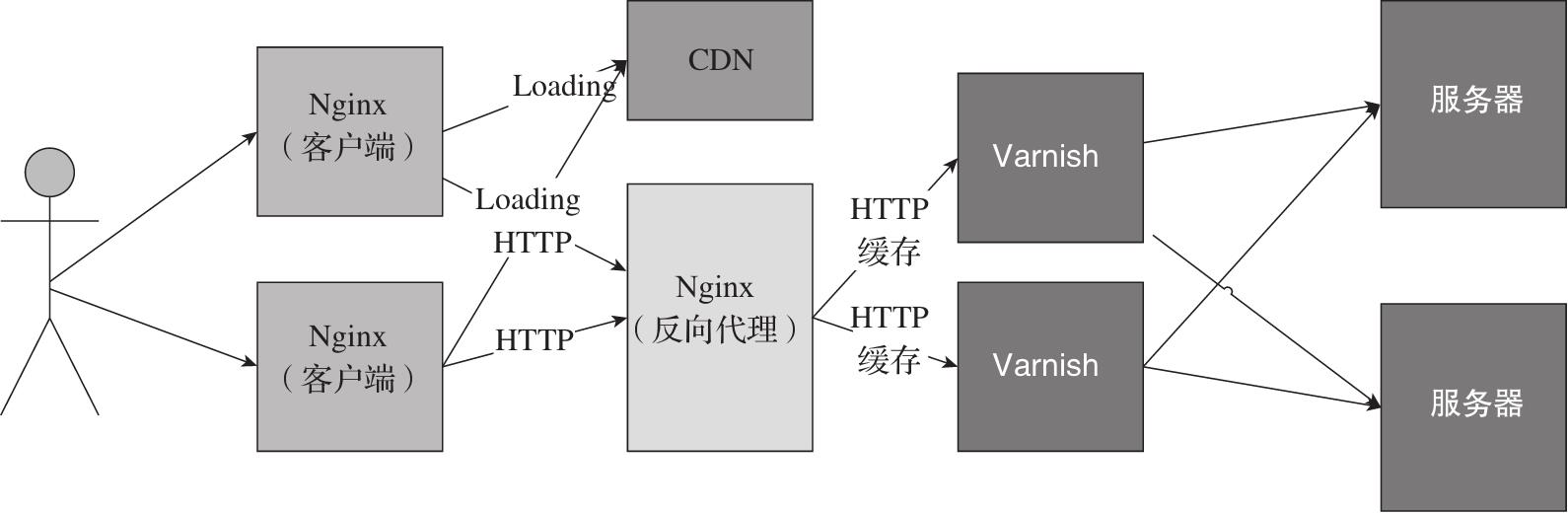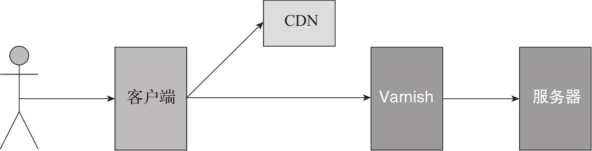 客户端同服务器端采用HTTP请求方式交互,由于电商系统中有很多静态文本信息以及很多变更很少的数据,如省市区、产品基本信息、介绍等,大量重复、多余的请求会频繁消耗资源,那是否这些信息每次都需要请求服务器去获取呢?对于上述信息变动非常少,完全不用经常去请求服务器获取,可以使用缓存技术,缓存两部分数据,即永不变资源和一定期间变动较少资源。对于前者,毫无疑问,可以完全缓存本地,但对于后者,需要考虑缓存多久、信息变动后如何自动更新等。基于以上两点引入Varnish,基于HTTP加速缓存技术。客户端无须直接请求服务器获取数据,客户端的请求会进入Varnish,当需要获取新的数据时,Varnish会根据请求类型和状态判断服务器数据是否有变更,如有变更,则主动请求服务器获取数据,然后缓存至本地,后续请求直接从本地缓存获取数据返回,有效减少请求服务器次数。结构如图2-6所示。