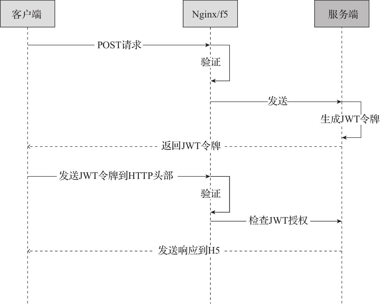 前端请求后端接口存在安全等问题,外界可以直接访问页面及接口,需要服务器端的接口授权给发起请求的客户端,引入JWT技术,通过JWT令牌让服务端接口授权于客户端,结构如图2-7所示。