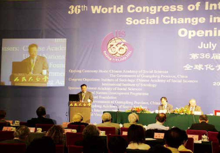 2004年7月7日,在人民大会堂举行的第36届世界社会学大会全体会议上做主题报告