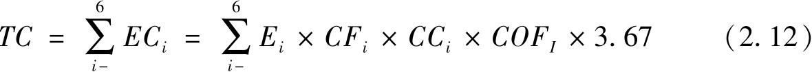 其中, TC 表示各类能源消费产生的二氧化碳排放总量的估算值; i =1, 2,…,7表示能源消费的种类,包括煤炭、焦炭、汽油、煤油、柴油、燃料油和天然气共7种; E i 表示各地区第i种能源的消费量; CF i 表示发热值; CC i 表示碳含量;表示氧化因子; CF i × CC i × COF i 表示碳排放系数, CF i × CC i × COF i ×3.67则表示二氧化碳排放系数。