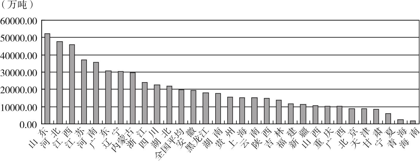 图2.16是我国1997—2011年30个省市地区二氧化碳排放量均值的降序排列图。其中,二氧化碳排放量均值高于全国二氧化碳排放均值的省市地区有:山东、河北、江西、江苏、河南、广东、辽宁、内蒙古、浙江、四川和湖北。排名靠前的前五个省份是山东、河北、江西、江苏和河南,分别占我国二氧化碳排放总量均值的8.71%、8.00%、7.68%、6.21%和5.95%。我国的主要二氧化碳排放大省均为传统工业,能源消费以煤炭为主。二氧化碳排放量排名靠后的五个省份分别是天津、甘肃、宁夏、青海和海南,分别占我国二氧化碳排放总量均值的1.46%、1.44%、0.98%、0.40%和0.30%。