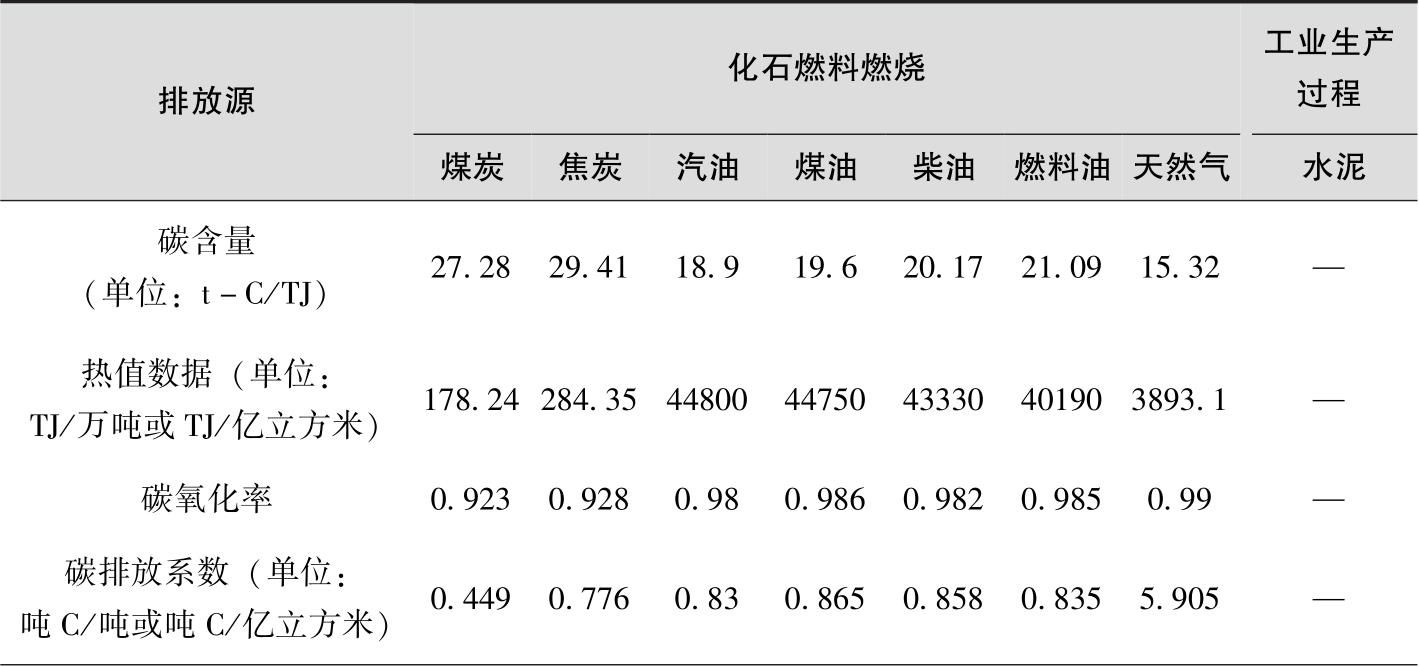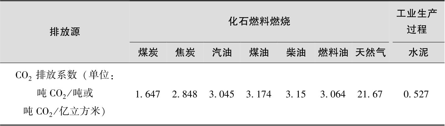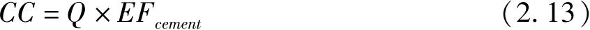 其中, CC 表示水泥生产过程中二氧化碳排放总量, Q 表示水泥生产总量,而 EF cement 则是水泥生产的二氧化碳排放系数。本节估算水泥生产的二氧化碳排放量时,仅仅计算了化学反应产生的二氧化碳排放量,而没有包含水泥生产过程中燃烧化石燃料而造成的二氧化碳排放量。表2.17列出了各类排放源的CO 2 排放系数。