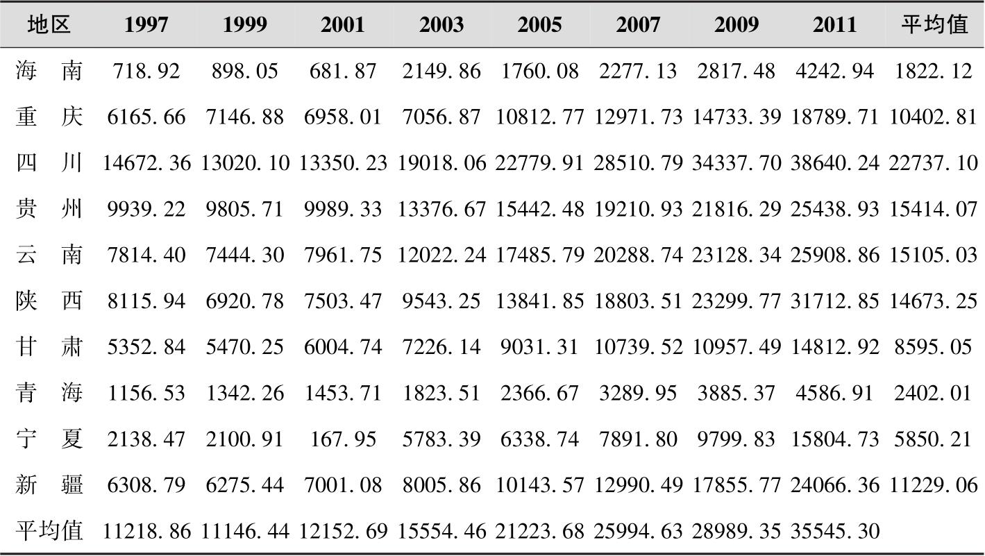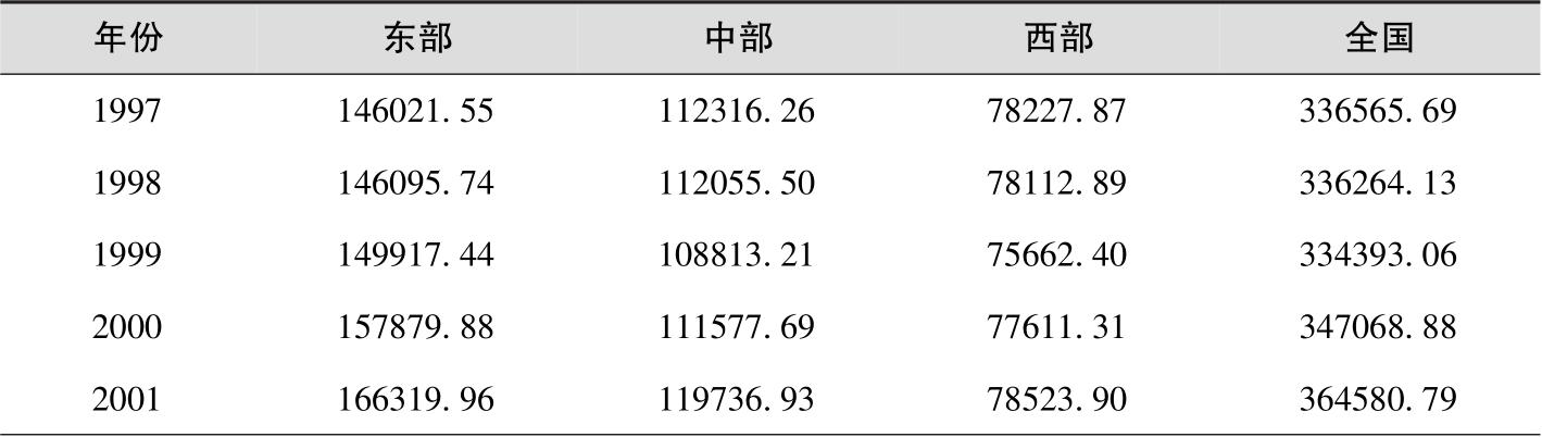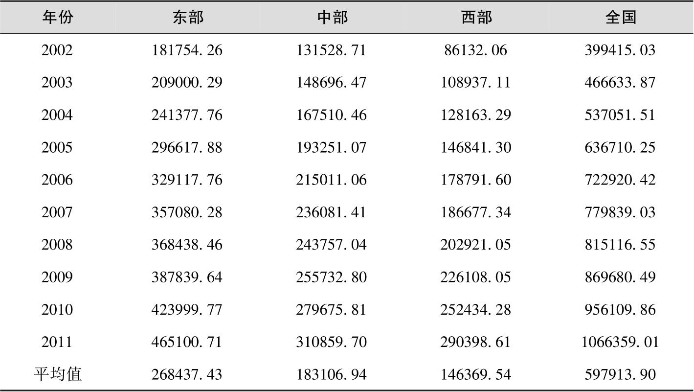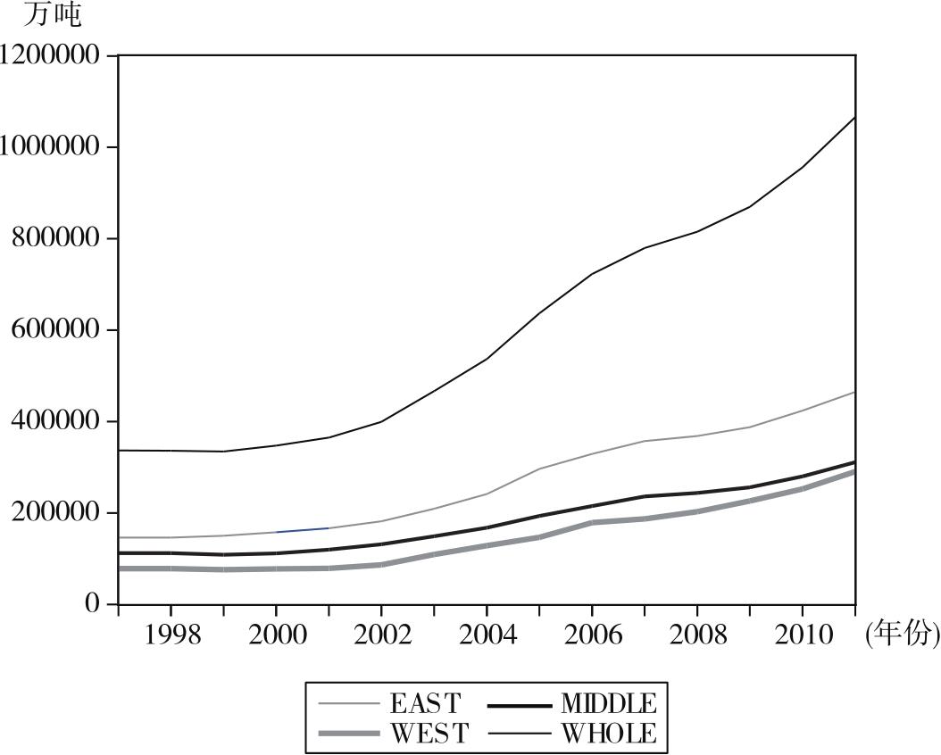 表2.19的数据反映了我国及东中西部三大区域碳排放量情况。从总体上来看,1997—2011年我国的二氧化碳排放量呈现持续增长的趋势,从1997年的336565.69万吨增长至2011年的1066359.01万吨,增长幅度达到729793.32万吨,短短15年间排放量大约增长了2.17倍。从时间变化趋势上看,我国的二氧化碳排放量的增长过程可分为三个阶段:缓慢增长阶段、快速增长阶段、增速下降阶段。由图2.15可以明显看出,在1997—2002年我国二氧化碳排放量处于缓慢增长的阶段,这个阶段我国的二氧化碳排放量年均增长为3.48%。这个阶段产生的原因主要是由于亚洲金融危机对我国经济的影响,此时我国经济增长速度减缓,对外贸易活动减少,这在一定程度上减少了二氧化碳的排放。从2003年起,亚洲各国陆续走出金融危机的泥潭,我国经济发展加速,但由于我国高投入、高消耗、高污染的粗放型经济增长方式,使得我国这一阶段的二氧化碳排放量处于快速增长期,2003—2007年我国二氧化碳排放量增速达到13.70%。之后我国二氧化碳排放量增速有所下降,2008—2011年增速为9.37%。虽然增长率依旧不低,但是相比于2003—2007年还是呈现下降趋势。这说明我国意识到能源环境的重要性,开始探寻低碳经济路径,为实现绿色生产付出努力。特别是在2008年10月29日我国公布的《中国应对气候变化的政策行动》的白皮书,郑重声明了我国应对气候变化问题的积极态度和相关行动,决定把发展低碳经济作为一个突破点,指导我国未来的能源发展,走可持续发展道路。