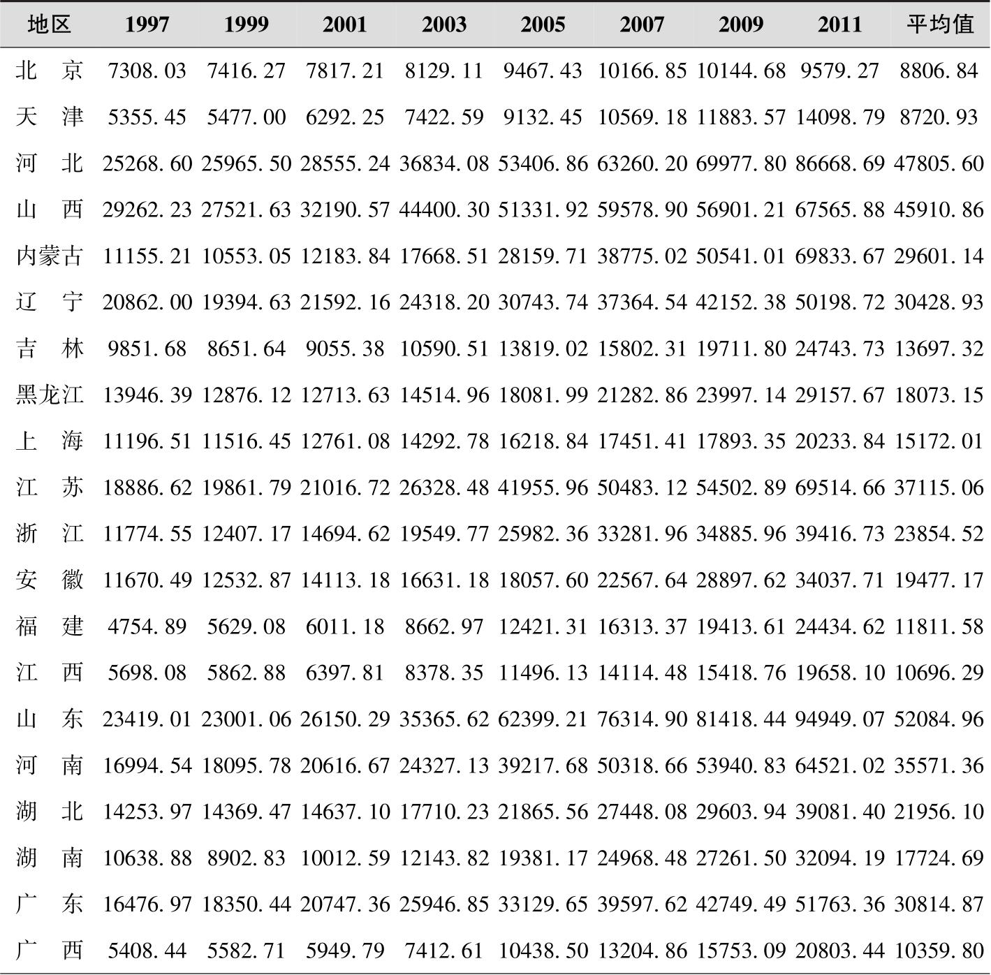 本节参照IPCC(2006)以及国家气候变化对策协调小组办公室和国家发改委能源研究所(2007)的方法,相对客观的详细估算了我国30个省(直辖市、自治区)的1997—2011年的二氧化碳排放量。从数据中可以明显看出,我国各省(直辖市、自治区)的二氧化碳排放量从整体上基本都呈现出上升趋势,地区差异比较显著。总体上来讲,我国的二氧化碳排放量呈现出由东到西依次递减的规律特征,东部地区的二氧化碳排放量最多,中部地区次之,西部地区二氧化碳排放量最少,而且东部地区的二氧化碳排放在绝对量上大大超过中、西两大区域。