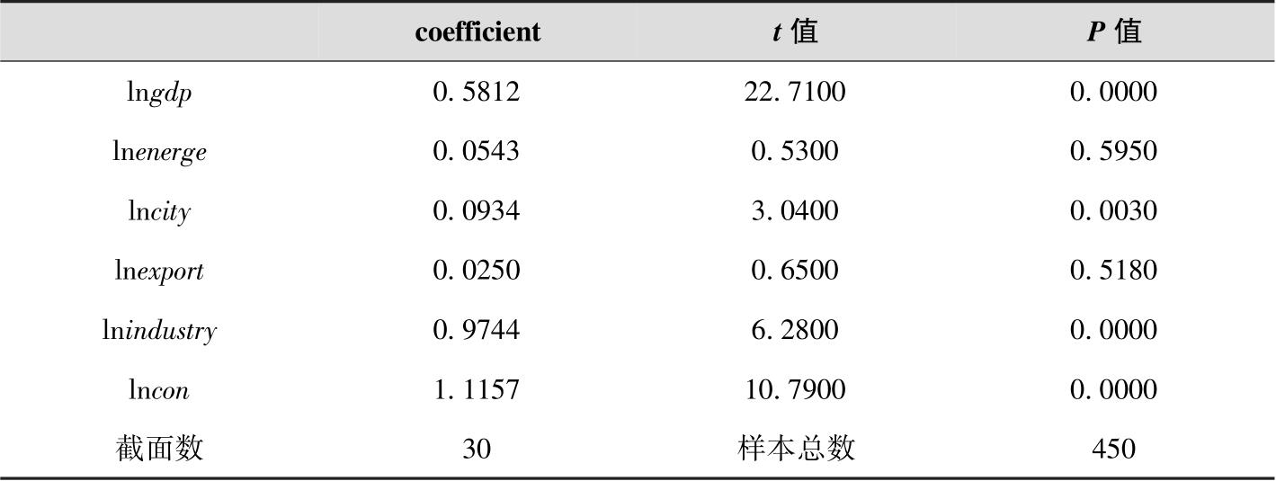 在二氧化碳排放量相关影响因素的实证分析中,用Stata软件得出的估计结果见下表2.20。