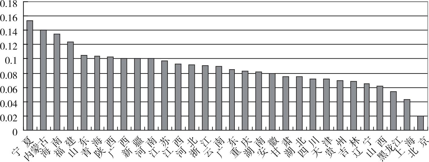 图2.17是我国1997—2011年各省碳排放年均增长率的降序排列图。可以看到,二氧化碳排放年均增长率排名前五的省份是宁夏、内蒙古、海南、福建和山东,其中宁夏二氧化碳排放的年均增长率达到15.36%。宁夏出现较高二氧化碳排放速度的原因与其快速的经济增长密切相关,1997年宁夏的国内生产总值为210.92亿元,2011年为2102.21亿元,增幅达到1891.29,增长了8.97倍。第二产业的产值占国内生产总值的比重由1997年的41.6%增长到了2011年的50.2%,增长了8.6个百分点。快速的经济发展及不合理的产业结构刺激了二氧化碳的高速排放。除了以上二氧化碳排放年均增长率排名靠前的省份外,青海、陕西、广西和新疆的年均增长率也均超过了10%,高于全国8.59%的平均增长水平。排名靠后的五个省份为辽宁、山西、黑龙江、上海和北京,其二氧化碳排放的年均增长率分别为6.47%、6.16%、5.41%、4.32%和1.95%,其中北京二氧化碳排放年均增长率以1.95%位居全国最低。