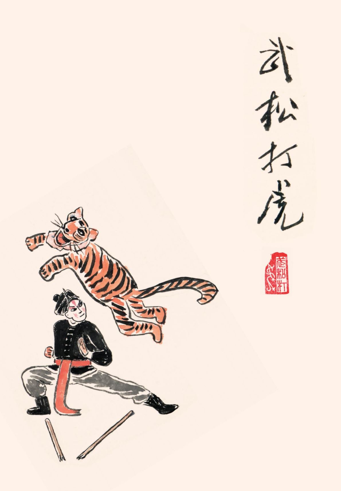 画《武松打虎》,我脑子里一下就有了画面:武松矮身弓箭步,老虎在他头上扑过,而那棍子就断在一旁,突出了形势的惊险和武松的英勇。