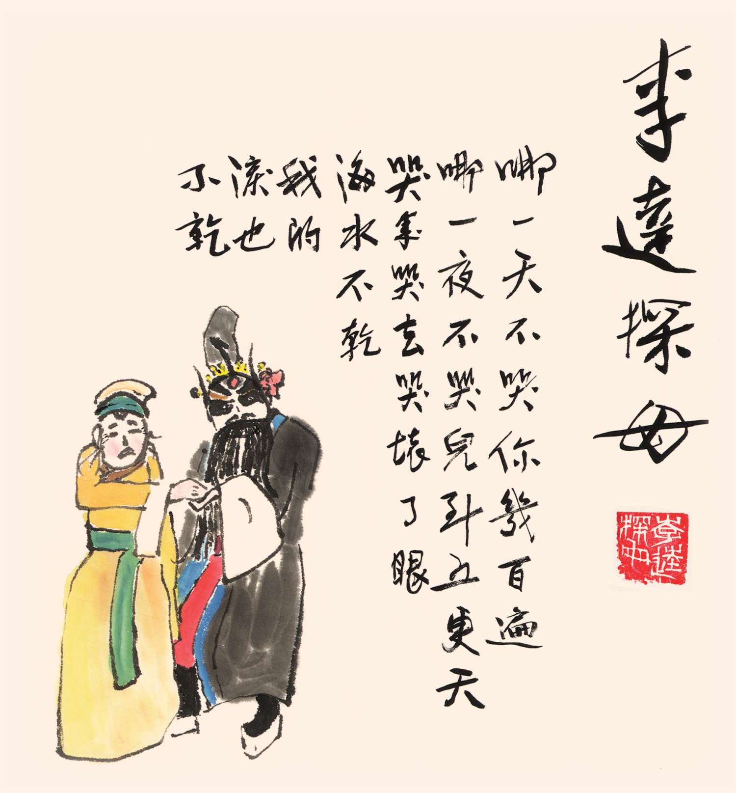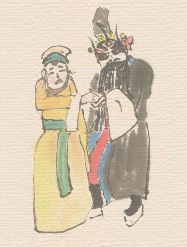 净行就是花脸了,主要分铜锤花脸和架子花脸。李逵就是架子花脸,以功架(动作、造型)表演为主。因为《二进宫》里的徐延昭捧着铜锤站在那儿一直唱,后来就把偏重唱的花脸叫作铜锤花脸。还有一种花脸会武打,像《打焦赞》里的焦赞老是被小丫头杨排风打倒在地,就叫作“摔打花脸”也叫“武花脸”。《李逵探母》里的李逵虽然也腰插双斧,也曾打败李鬼,但那不算有功夫的武打,只能叫比画比画。