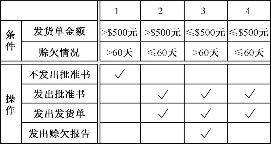 下面以检查发货单为例,说明判定表的构成,如图2.14所示。