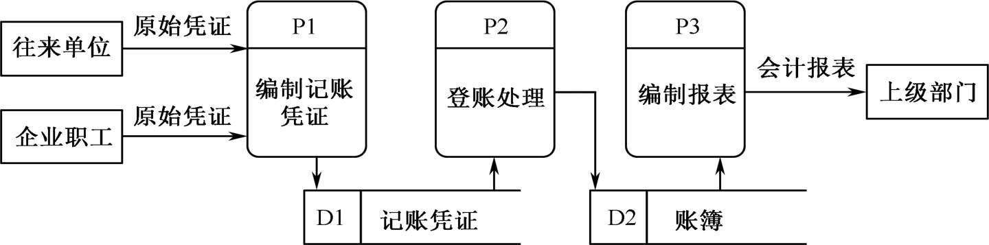 从图2.11可以看出数据流有原始凭证、会计报表、记账凭证、账簿等。数据存储包括记账凭证和账簿信息。加工处理有编制记账凭证、登账处理和编制报表。而源点和终点则是往来单位、企业职工和上级部门。