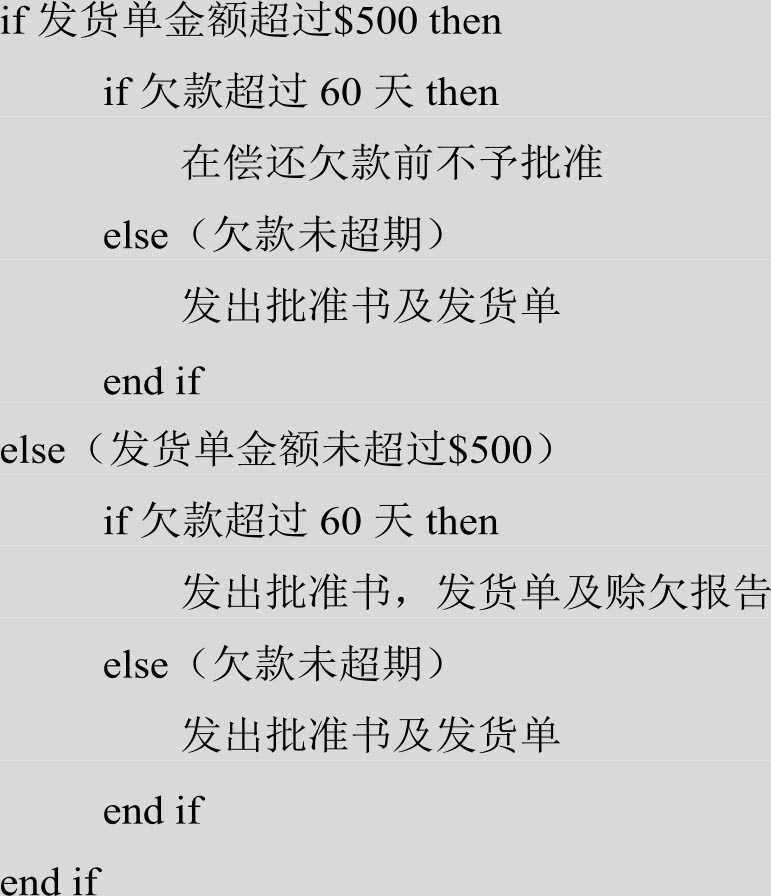 没有一种统一的方法来构造判定树,也不可能有统一的方法,因为它是以用结构化语言,甚至是自然语言写成的叙述文作为构造树的原始依据的,但还是可以从中找出一些规律。首先,应从文字资料中分清哪些是判定条件,哪些是判定做出的结论。例如,在上面的例子中,判定条件是“金额>$500,欠款≤60 天的发货单”,要判定的结论是“发出批准书和发货单”。然后,从资料叙述中的一些连接词(如除非、然而、但、并且、和、或……)中,找出判定条件的从属关系、并列关系、选择关系等。
