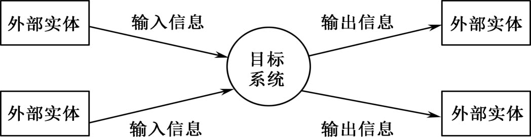 最初,结构化分析方法仅讨论数据流建模,目标系统被表示成如图2.10所示的数据流程图。系统的功能体现在核心的数据变换中,系统的输入源于用方框表示的外部实体,这种输入引发系统的数据变换,产生传递给外部实体的输出。