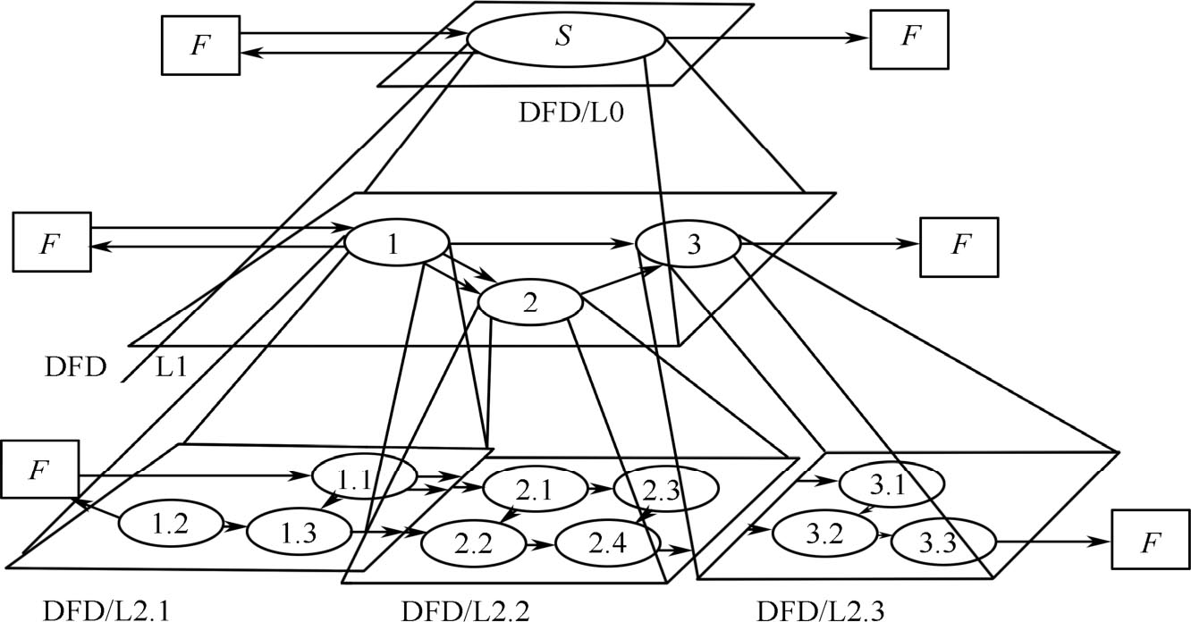 图2.13为分层数据流程图示例,数据处理 S 包括3个子系统1、2、3。顶层下面的第 1 层数据流程图为 DFD/L1,第 2 层数据流程图 DFD/L2.1、DFD/L2.2及DFD/L2.3分别是子系统1、2和3的细化。对任何一层数据流程图来说,我们称它的上层图为父图,在它下一层的图则称为子图。