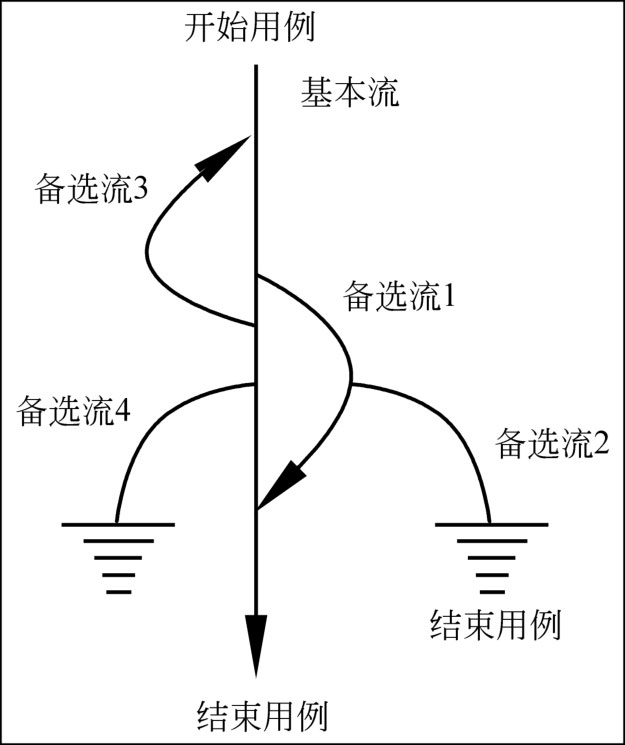 (1)基本流:基本流是经过用例的最简单的路径,即在无任何差错的情况下,程序从开始直接执行到结束的流程,如图7.2所示的中间的直线。通常,一个业务仅存在一个基本流,且基本流仅有一个起点和一个终点。