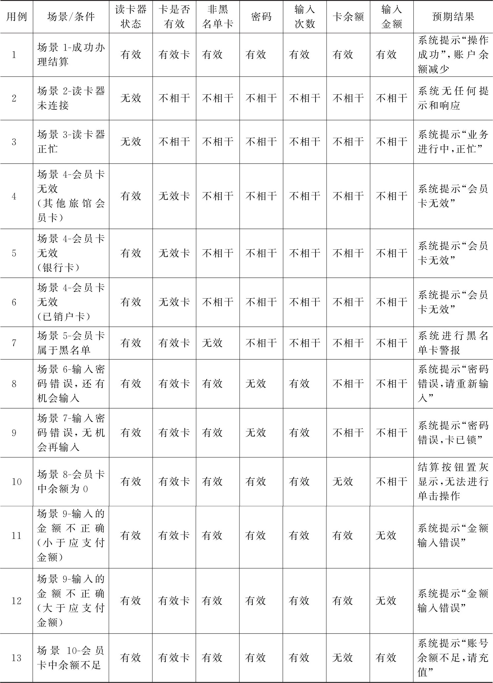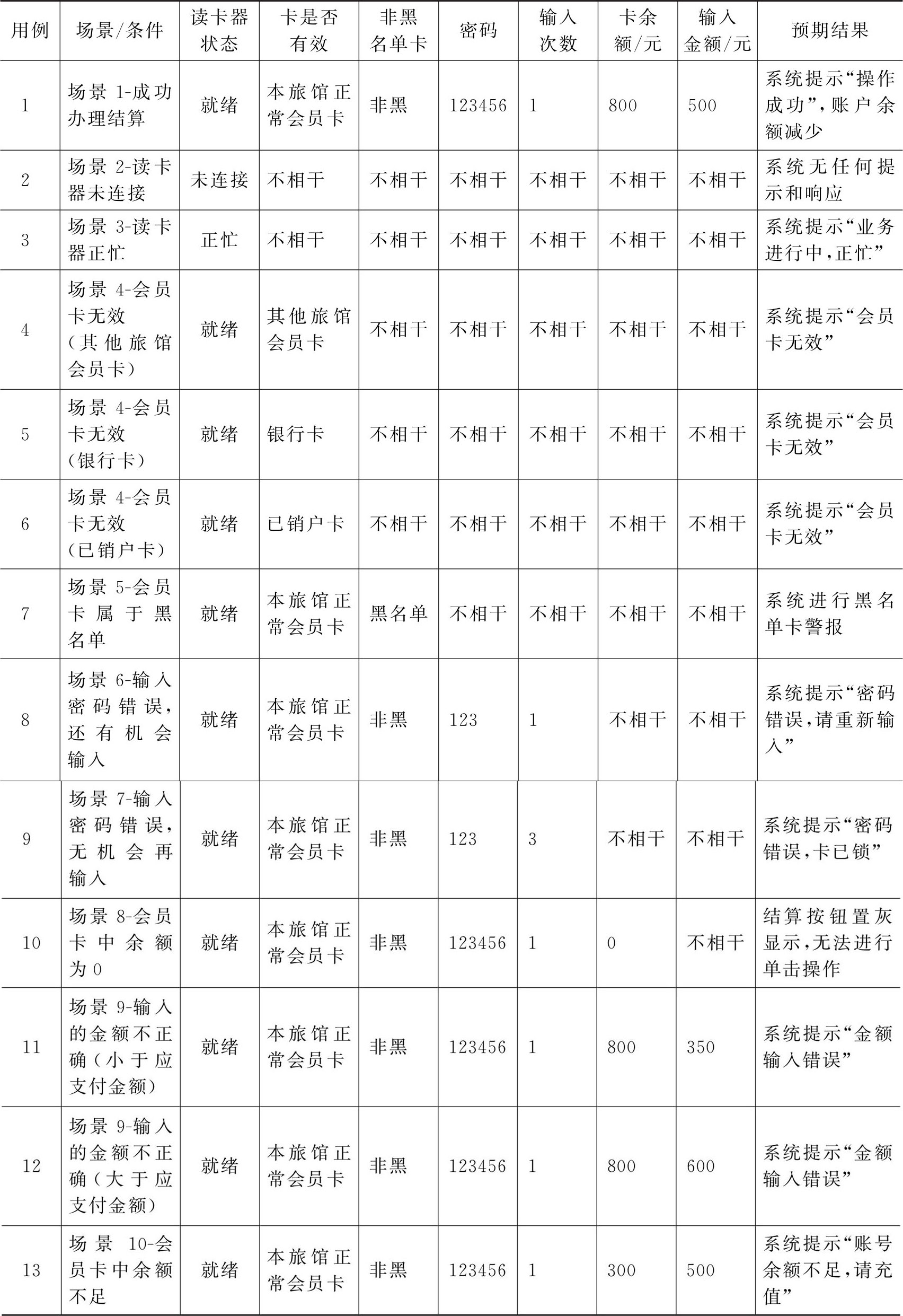 至此,可利用表7.10中的测试用例协助开展测试。此处仅为采用场景法对旅馆住宿系统会员卡结算流程进行测试用例设计的步骤,与此同时,读者可依据等价类划分法或其他方法进行测试用例的补充,限于篇幅,不再赘述。