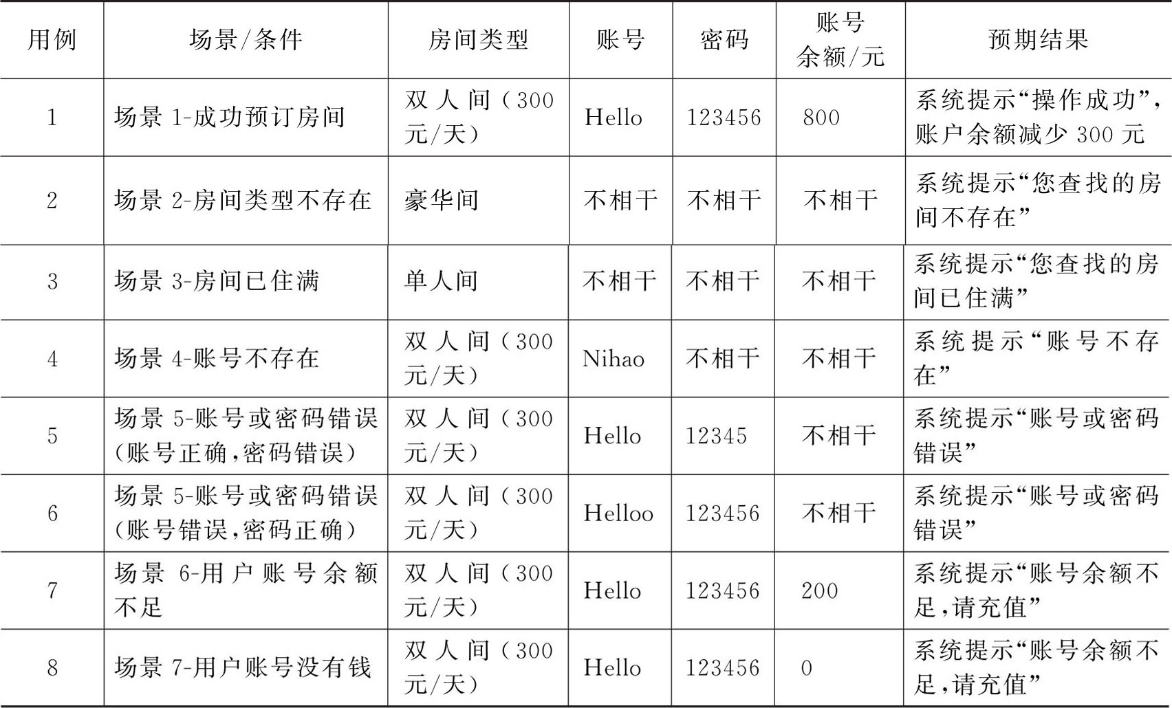 至此,可利用表7.5中的测试用例协助开展测试。此处仅为采用场景法对旅馆住宿系统房间预订流程进行测试用例设计的步骤,读者可依据等价类划分法或其他方法进行测试用例的进一步补充,限于篇幅,不再赘述。
