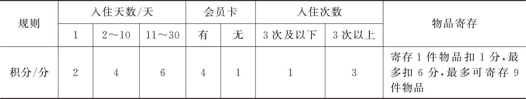 其中,折扣率根据入住天数(最多30天)、是否有会员卡(有卡、无卡)、入住次数(3次及以下、3次以上)和物品寄存个数的不同而有所不同,体现在不同的情况下对应的积分不同,10分及10分以上折扣率为70%,10分以下折扣率为90%,具体规则如表1.5所示。