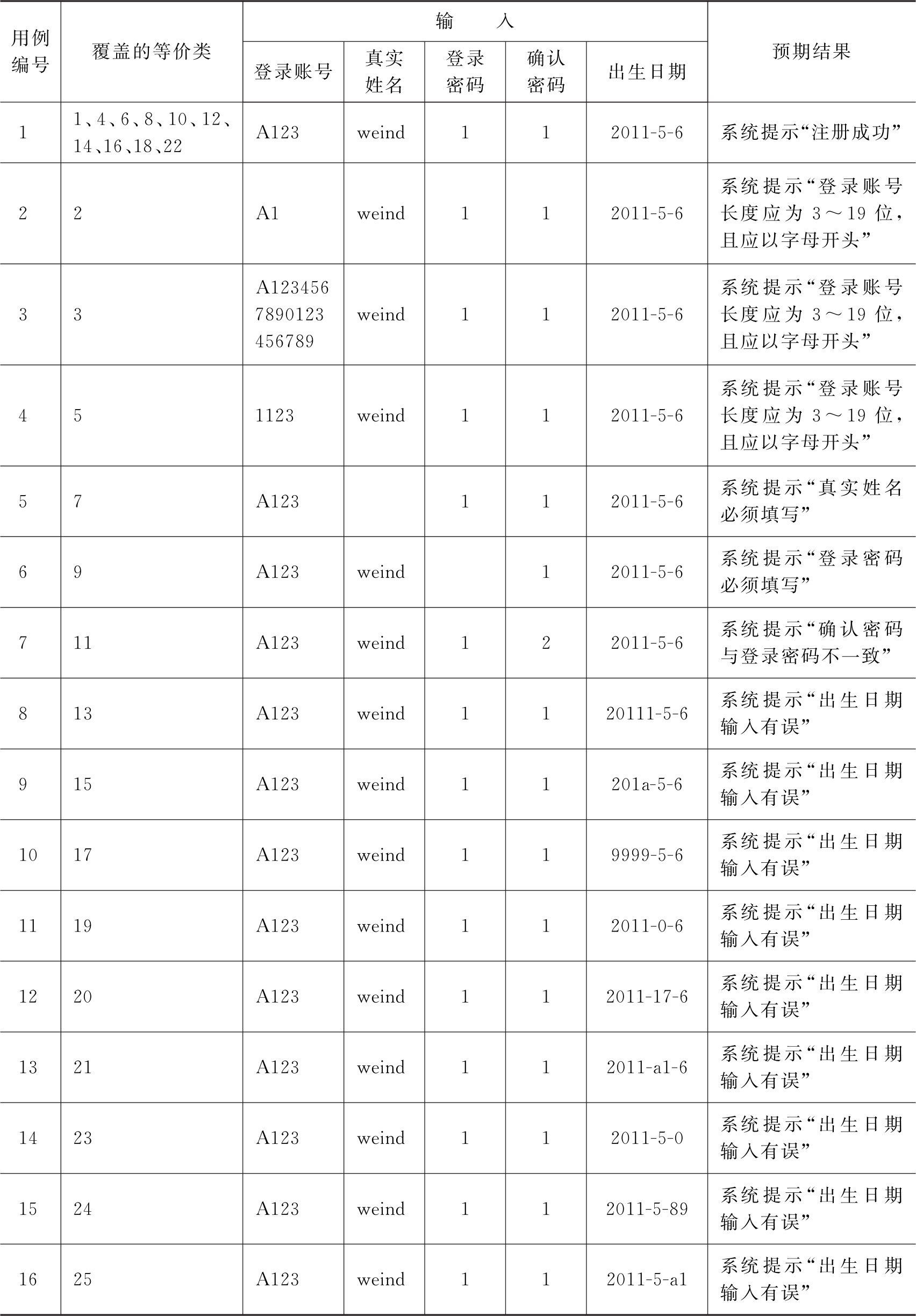第4步,设计一个新用例,使它仅覆盖一个尚未覆盖的无效等价类。重复该步骤,直到所有的无效等价类均被用例所覆盖,如表1.2所示。