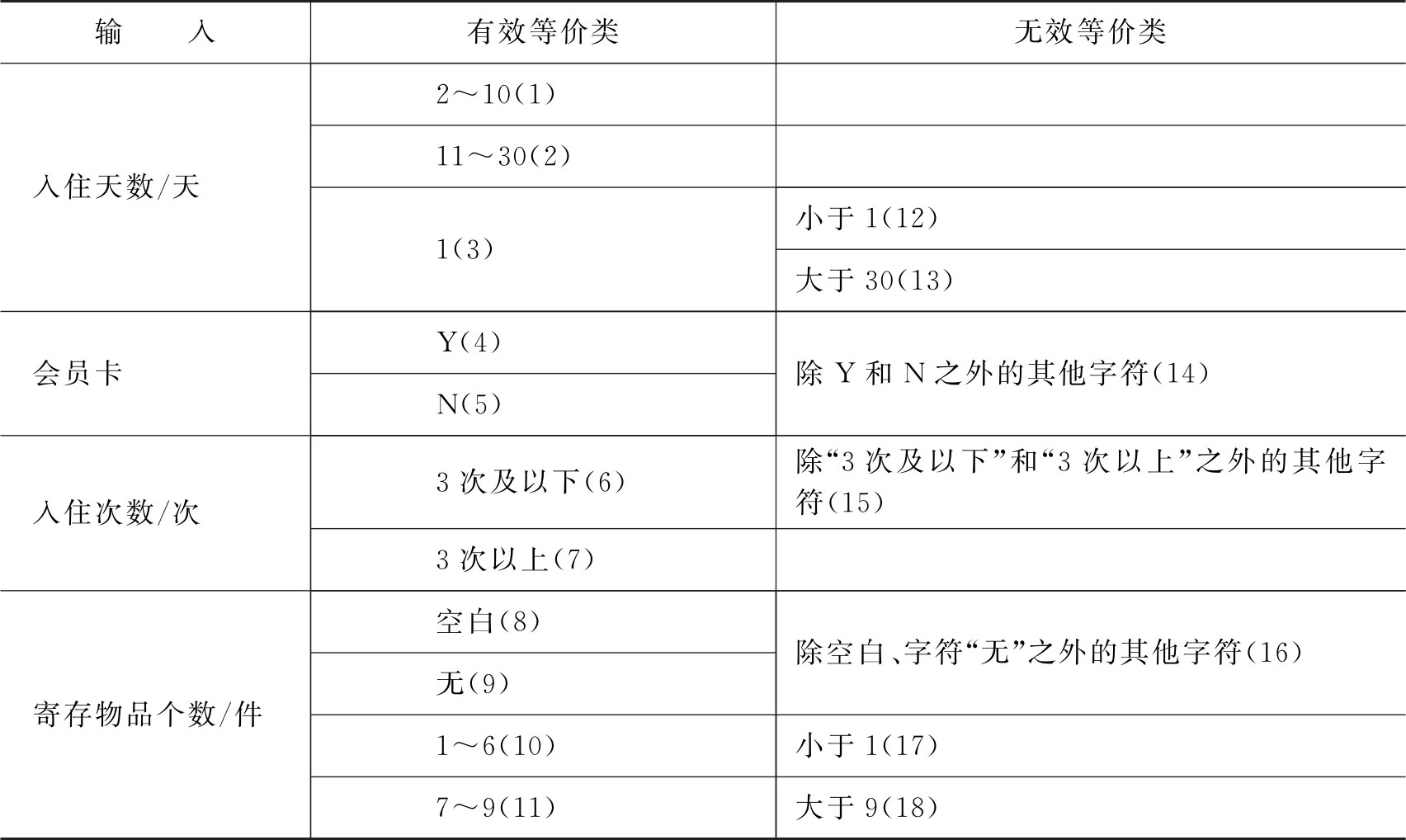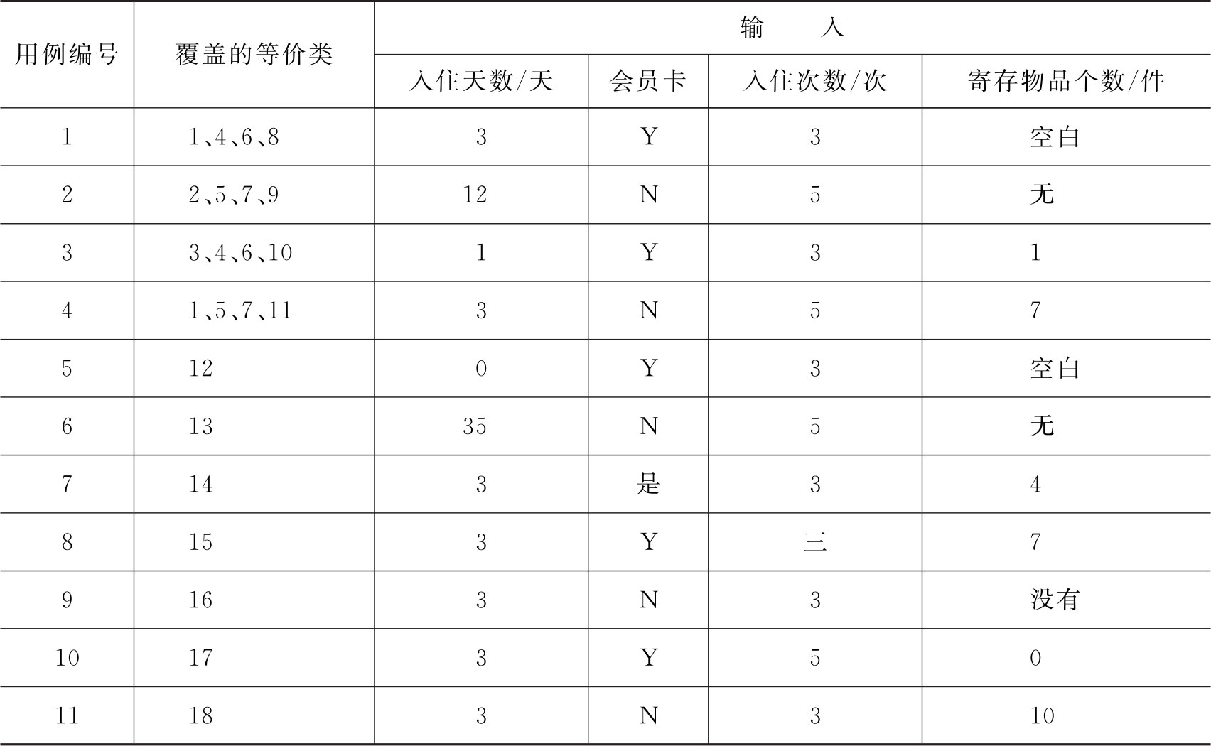 第3步,设计一个新用例,使它能够尽量多地覆盖尚未覆盖的有效等价类。重复该步骤,直到所有有效等价类均被用例所覆盖,如表1.2所示。
