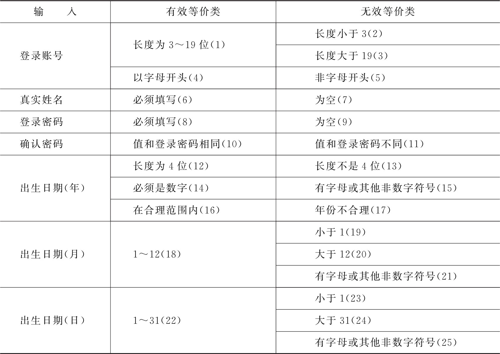 第2步,为等价类表中的每一个等价类分别规定一个唯一的编号,如表1.3所示。