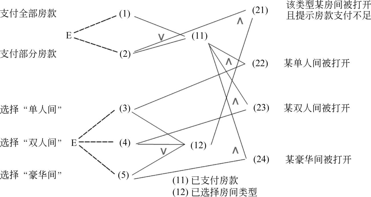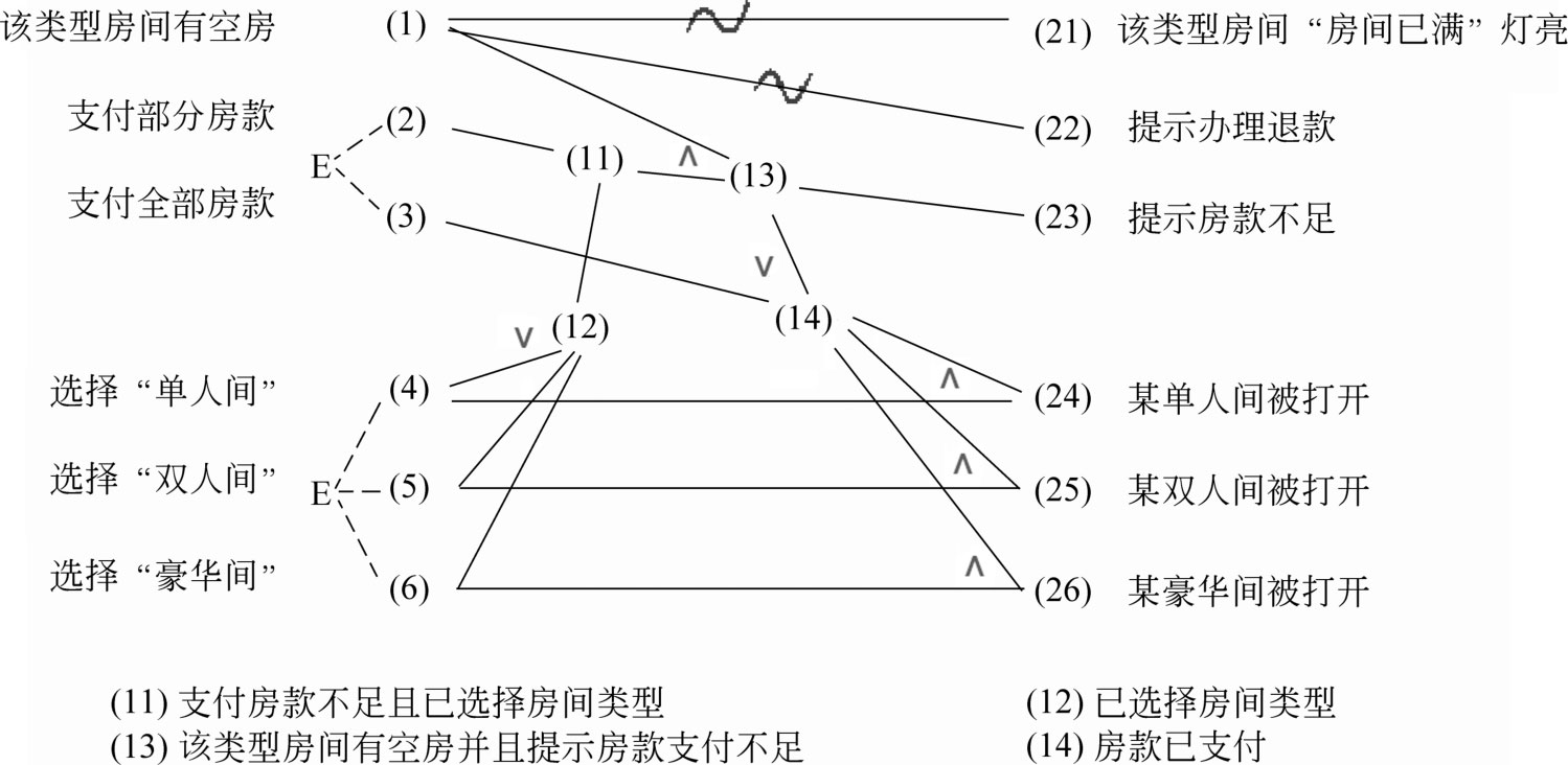 下面以旅馆住宿系统为例,针对忽略房间状态和考虑房间状态两种不同的需求情况,采用因果图法进行测试用例设计。