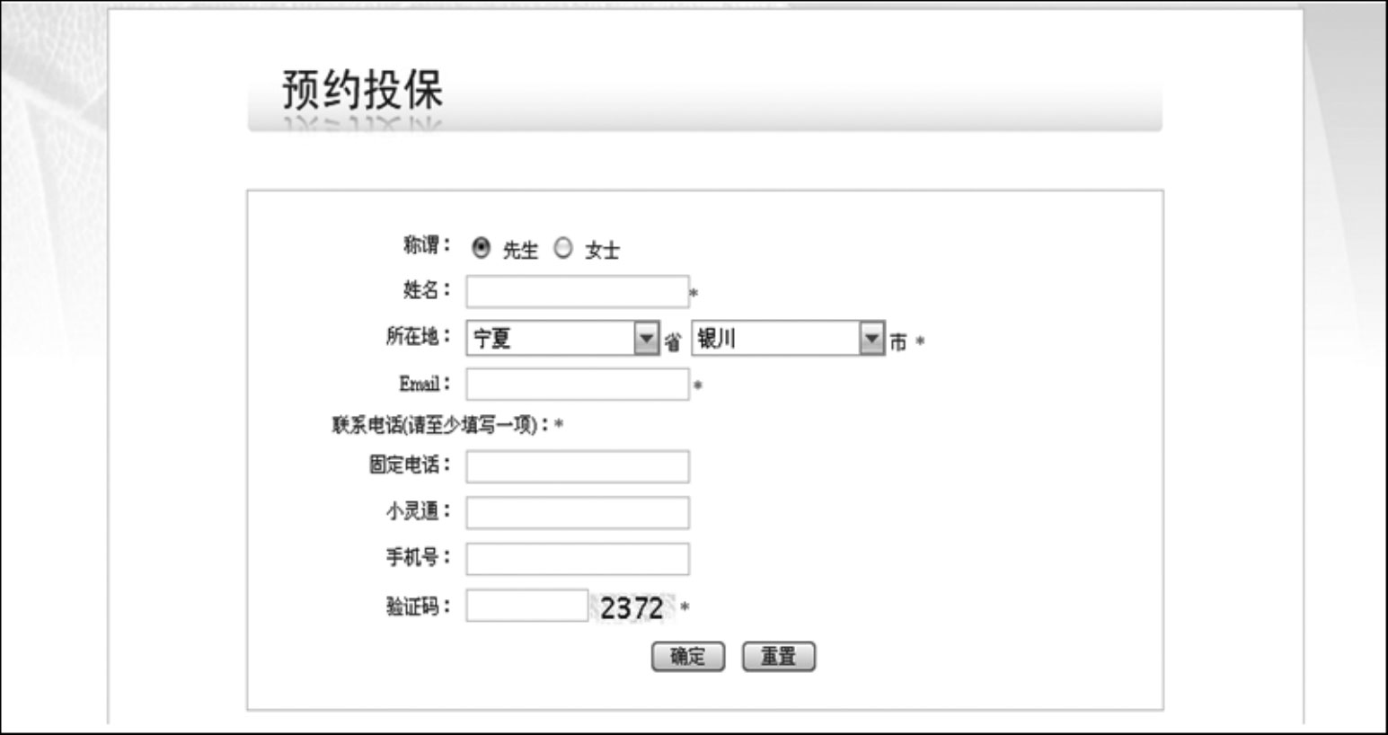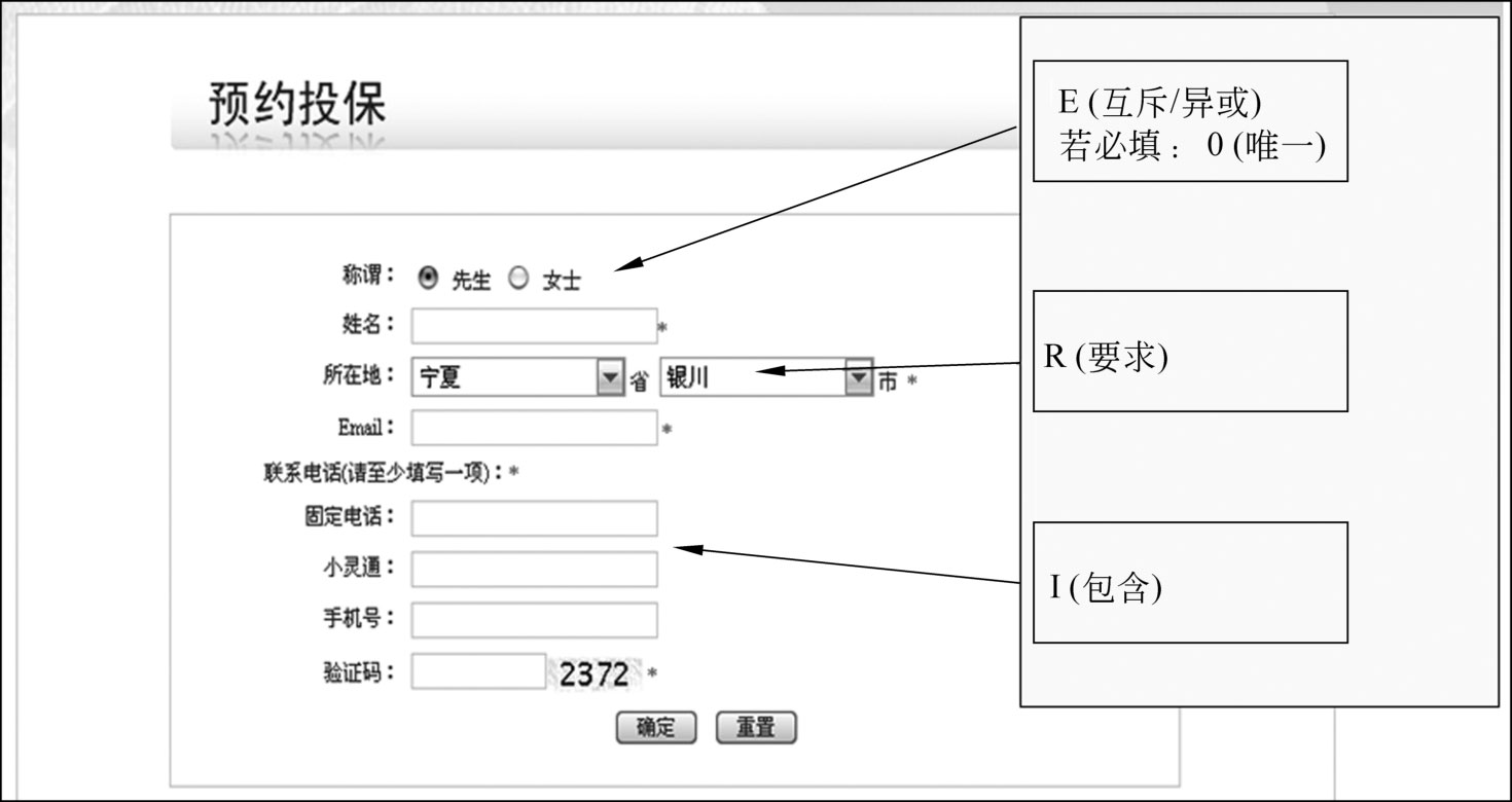 再如某保险公司的预约投保系统,界面原型如图3.2所示。读者针对此界面原型采用等价类划分法进行测试用例设计时,同样会忽略多种关系不能同时存在的情况。例如,“称谓”字段中“先生”与“女士”不能同时成立,最多仅能成立两者之一;“所在地”字段中,当选择某市时,该市所属省份必须同步出现,不能有选择某市后该市所属省份不出现的情况发生;“联系电话”字段中,“固定电话”“小灵通”及“手机号”至少填写一个即可。