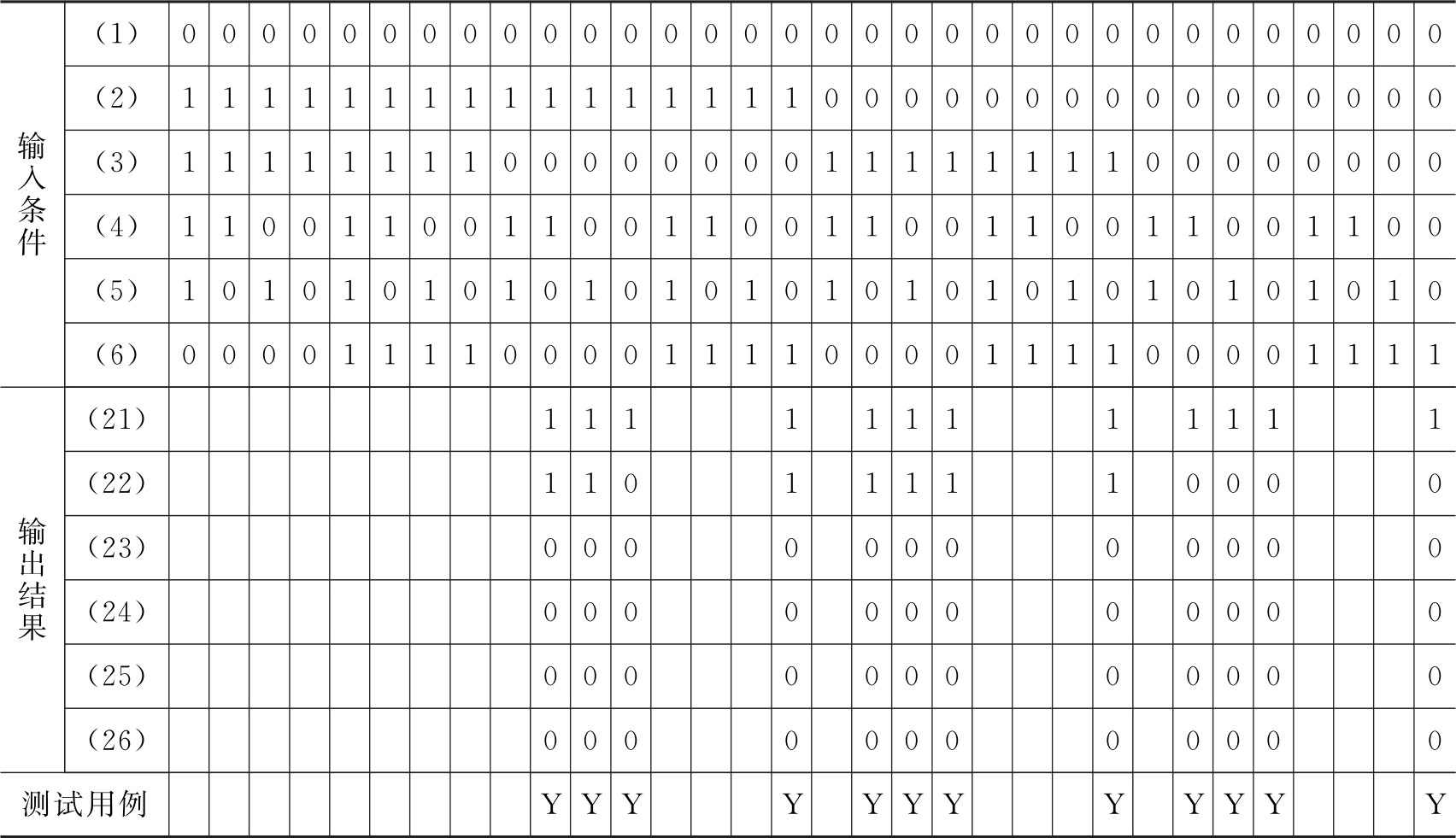 第4步,在判定表中,空白部分表示因违反约束条件而不可能出现的情况,故不对此进行测试用例设计。将表3.3和表3.4作为确定测试用例的依据。设计测试用例如表3.5所示。