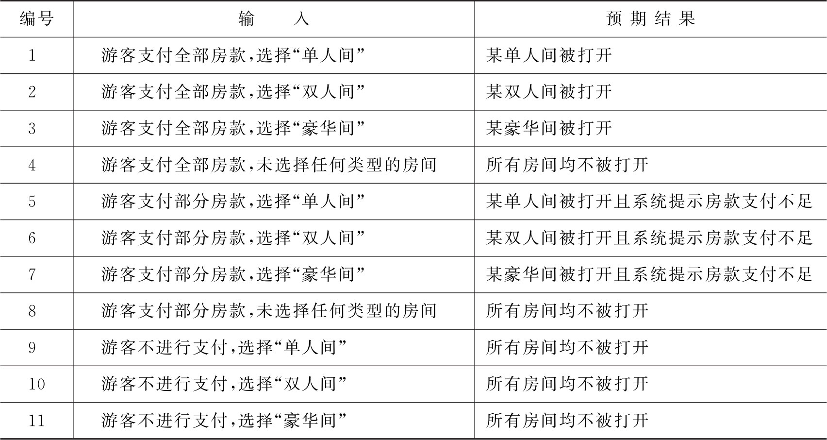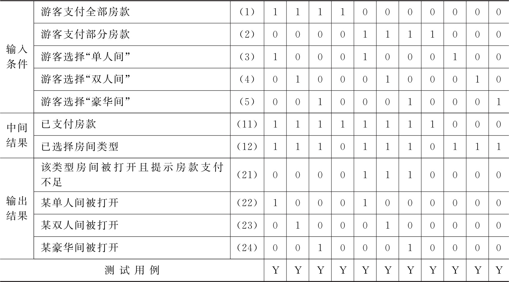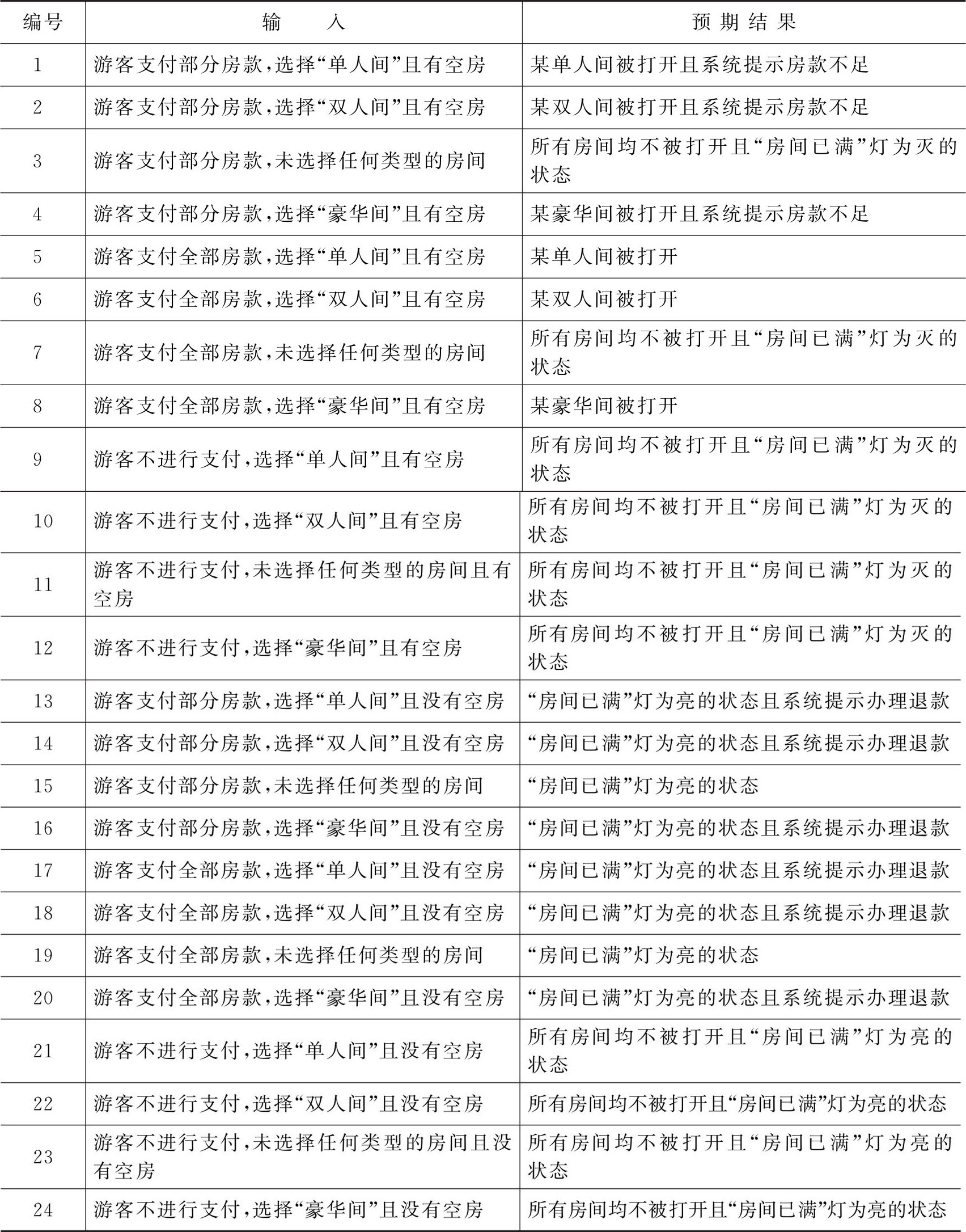 首先,基于上述需求,思考采用等价类划分法如何进行测试用例设计。读者采用等价类划分法进行上述需求的测试用例设计时,不难发现设计出的测试用例存在如下特点。其一,数量甚少。其二,仅着重考虑了各项输入条件,并未考虑输入条件的各种组合情况。例如,选择不同的房款支付方式及房间类型,在“房间已满”和“房间空余”的不同前提下,产生的结果会有所差异,此情况在等价类划分法中并未涉及和考虑。其三,未考虑各输入情况之间的相互制约关系。例如,“支付房款”与“支付定金”不能同时选择,最多只能选择一个;“单人间”“双人间”和“豪华间”不能同时选择,最多仅能选择一个等,上述列举的两种情况在等价类划分法中也并未涉及和考虑。