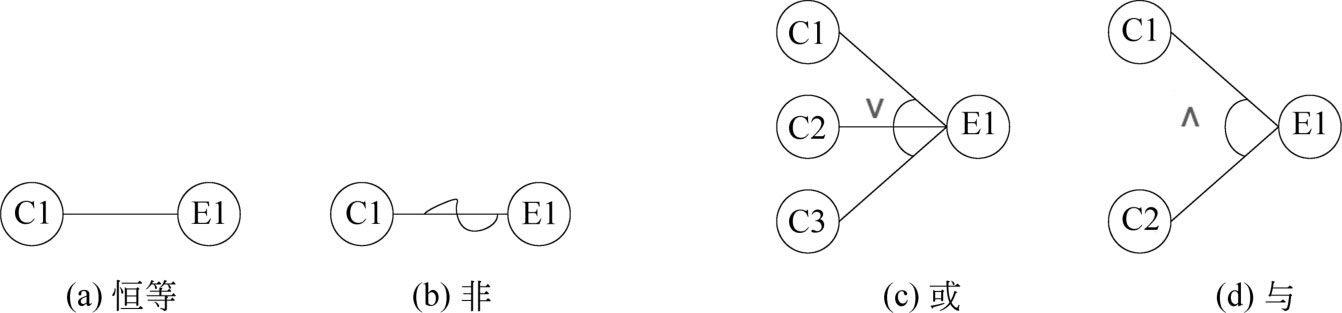 通过观察可以发现,图3.4中无法识别的符号较多,如E、∨等。下面结合图3.5,对因果图中的常用符号含义进行介绍。