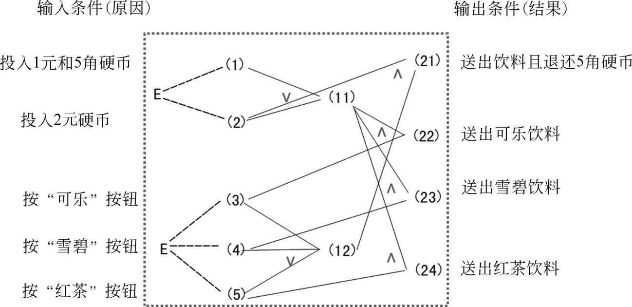 因果图法是从需求中找出因(输入条件)和果(输出或程序状态的改变),通过分析输入条件之间的关系(组合关系、约束关系等)以及输入和输出之间的关系绘制出因果图,再转化成判定表,从而设计出测试用例的方法,如图3.3所示。不难理解,该方法主要适用于各种输入条件之间存在某种相互制约关系或输出结果依赖于各种输入条件的组合时的情况。