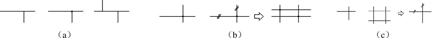导线的连接点有“T”形连接点和多线的“十”形连接点之分。对于“T”形连接点可加实心圆点,也可不加实心圆点,如图1-35(a)所示;对于“十”形连接点,必须加实心圆点,如图1-35(b)所示;而交叉不连接的,不能加实心圆点,如图1-35(c)所示。
