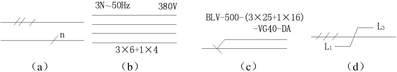 要表示导线的型号、截面、安装方法等,可采用短画指引线,加标导线属性和敷设方法。如图1-33(c)所示,表示导线的型号为BLV(铝芯塑料绝缘线),其中3根截面积为25mm 2 ,另1根截面积为16mm 2 ;敷设方法为穿入塑料管(VG),塑料管管径为40mm,沿地板暗敷。