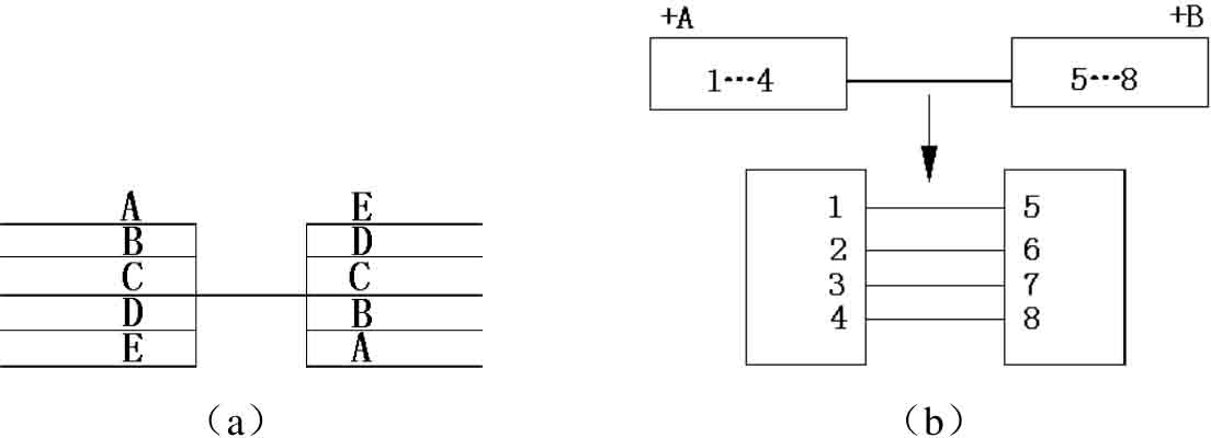 当导线汇入用单线表示的一组平行连接线时,在汇入处应折向导线走向,而且每根导线两端应采用相同的标记,如图1-37所示。