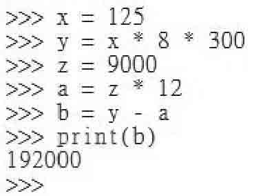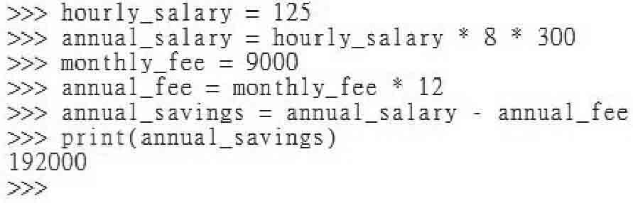 上述语句顺利地使用Python Shell计算了每年可以存储多少钱,可是上述使用Python Shell做运算潜藏的最大问题是,只要过了一段时间,我们可能忘记当初所有设置的变量是代表什么意义。因此在设计程序时,如果可以为变量取个有意义的名称,未来看到程序时,可以比较容易记得。下列是笔者重新设计的变量名称。