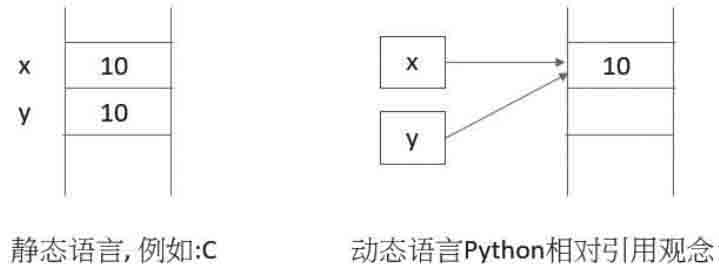 Python是一种动态语言,它处理变量的过程与一般静态语言不同。对于静态语言而言,例如C、C++,当声明变量时内存就会预留空间存储此变量的内容,例如,若声明与定义x=10, y=10时,内存内容如下方左图所示。