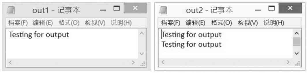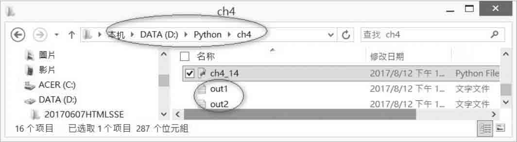 这个程序执行后需到ch4文件夹查看执行结果内容,如果执行程序一次,可以得到out1.txt和out2.txt内容相同。但是如果持续执行,out2.txt内容会持续增加,out1.txt内容则保持不变,下列是检查文件夹内容。