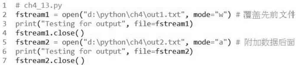程序实例ch4_13.py :将数据输出到文件的实例,其中,输出到out1.txt采用“w”模式,输出到out2.txt采用“a”模式。