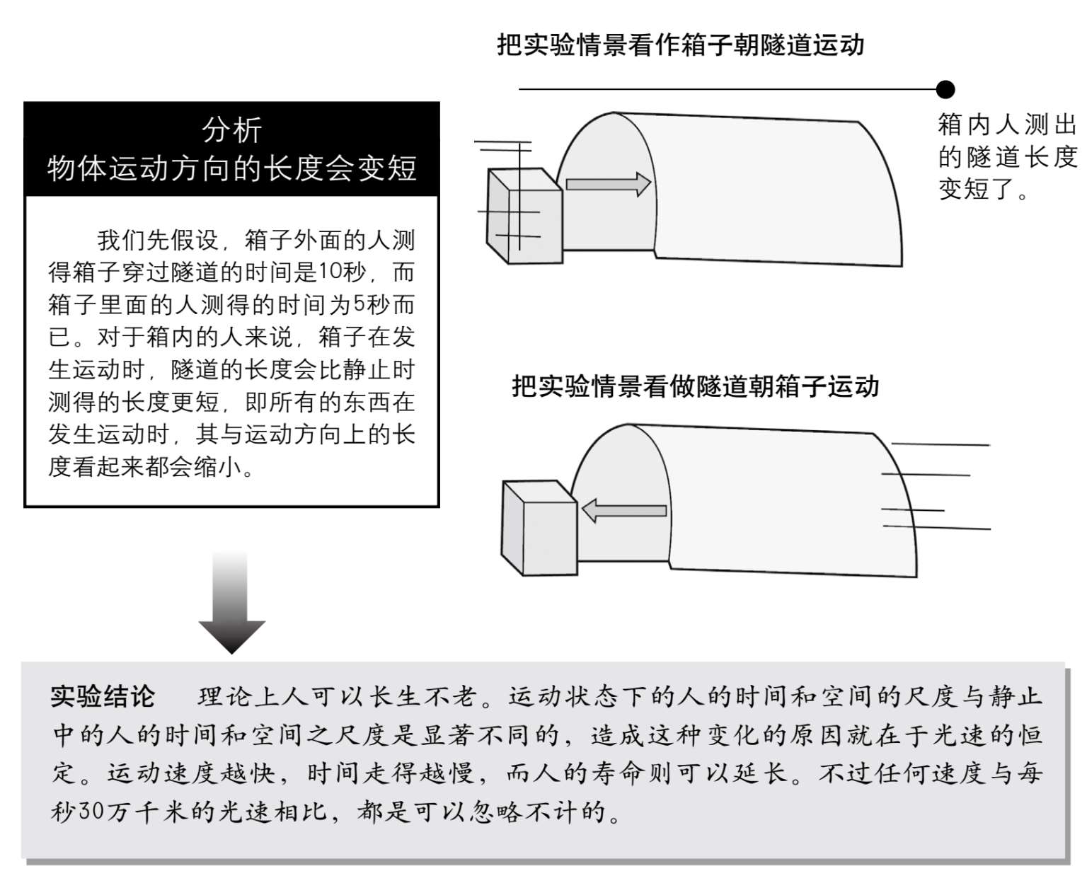 乍听之下实验结果令人费解,不过参照下列说明进行思考的话,疑惑就会全部解开了。总归一句话,由箱内的人来看的话,运动中的隧道长度会比静止时测得的长度更短。为了更容易地理解这个道理,我们可以更简单地表述上述实验的结论:如果将隧道移开的话,所有的东西包括尺子,一旦发生了运动,其运动方向的长度看起来都会缩小。