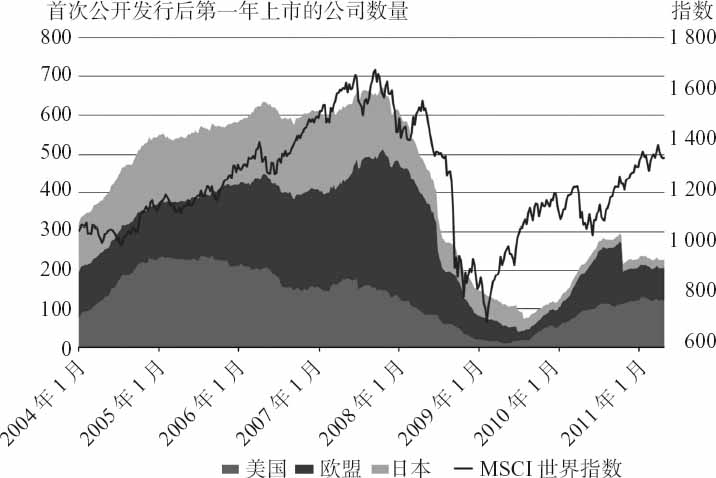 由于AIM还没从2007~2009年危机中恢复过来,上述情况可能发生变化。AIM需要其上市公司的数量达到临界值,才能够成为真正的欧洲成长型企业的上市平台(目前还没有达到,见图4-22)。来自其他交易所(特别是包括香港在内的亚洲交易所)的竞争阻碍了这一努力。
