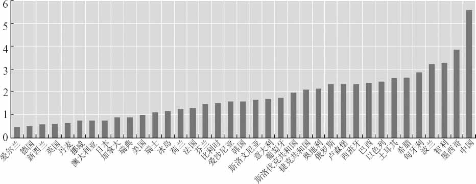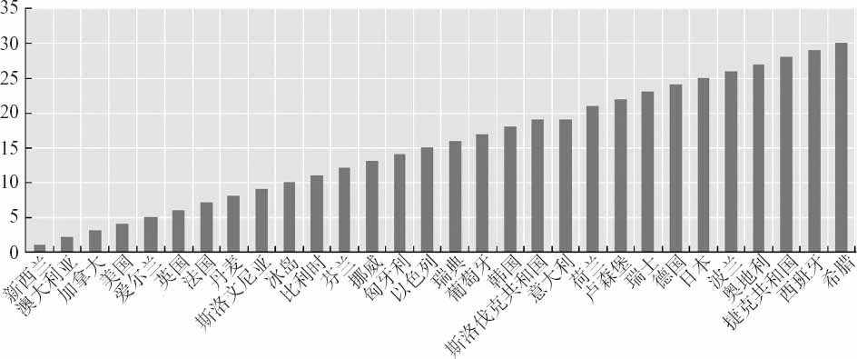 图4-7 启动一家创业企业:从最低限制到最高限制的国家排行(2010年)