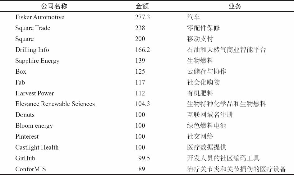 表4-3 2012年美国最大的15个创业投资项目(单位:百万美元)