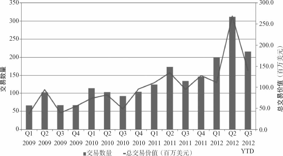 图4-9 天使投资和种子期创业投资交易的数量和总价值(2009年第1季度至2012年第3季度)
