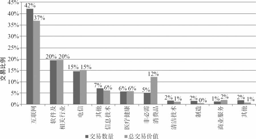 ·538项交易是通信和媒体行业公司(占总交易数的6.9%,91亿美元占投资总金额13.8%),其中北美325项、欧洲135项、亚太68项、拉丁美洲(包括加勒比海)5项、中东非洲5项。